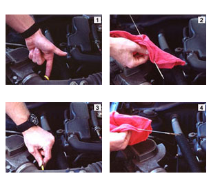 For an accurate reading of your oil level, switch off the engine, remove the dipstick, wipe it with a clean cloth or paper towel and then reinsert it. Remove the dipstick again to read the oil level (see figure below).