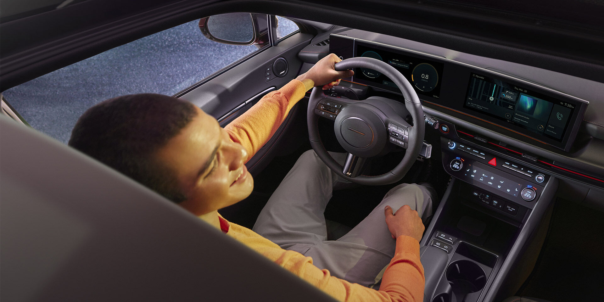 استمتع بالتناغم والتكامل مع الشاشة المنحنية البانورامية الأولى من نوعها مقاس 12.3 بوصة من هيونداي. فمن خلال الجمع بين نظام المجموعة ونظام الملاحة الصوتي والمرئي في وحدة واحدة سلسة، تُقدم لوحة العدادات أفقًا واسعًا.